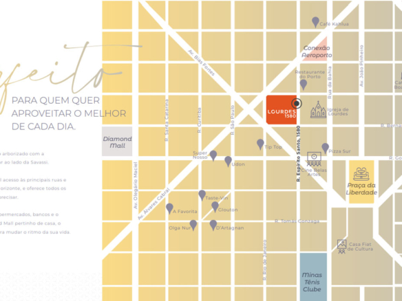 O Lourdes tem fácil acesso às principais ruas e avenidas de Belo Horizonte, e oferece todos os serviços que você precisar. Com farmácias, supermercados, bancos e o charmoso Diamond Mall