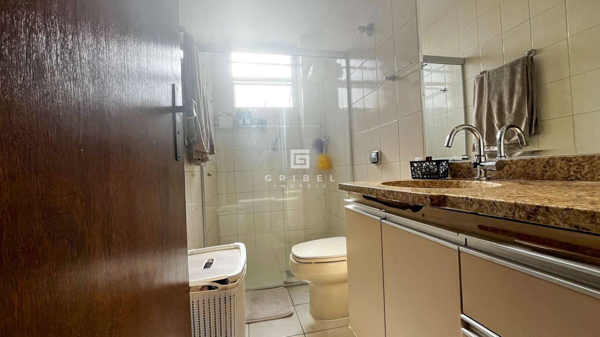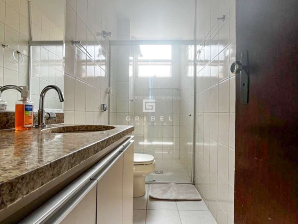 Banheiros (suíte e social) com armários, espelho e box em blindex