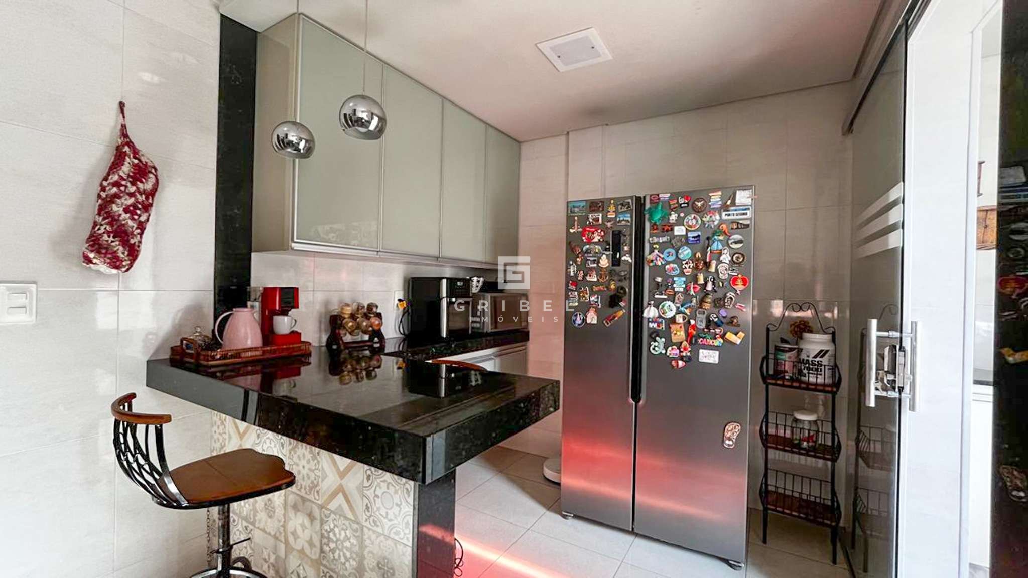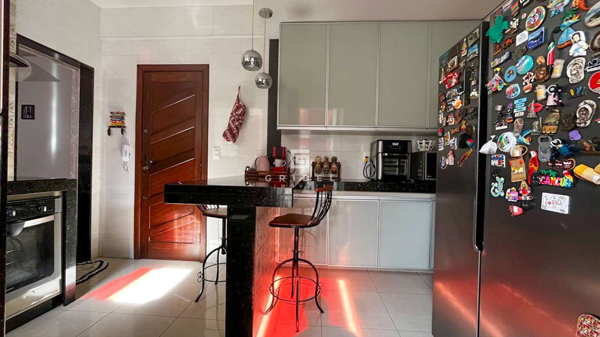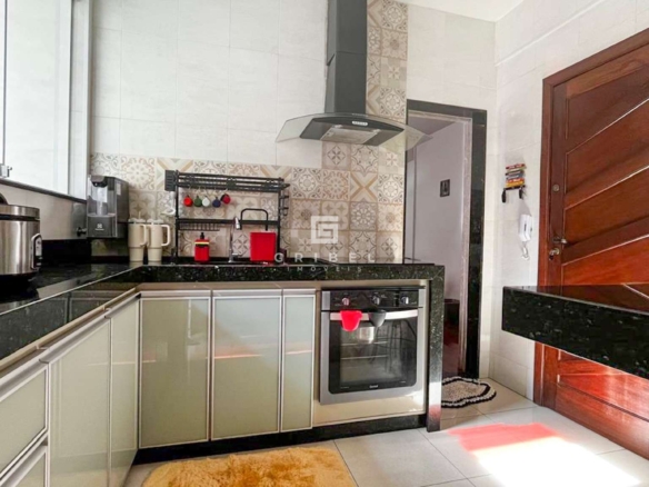Cozinha funcional com armários planejados, bancada em granito, coifa e piso em cerâmica