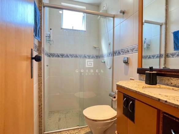 Banheiro social com bancada em granito, espelho, armários e box em blindex