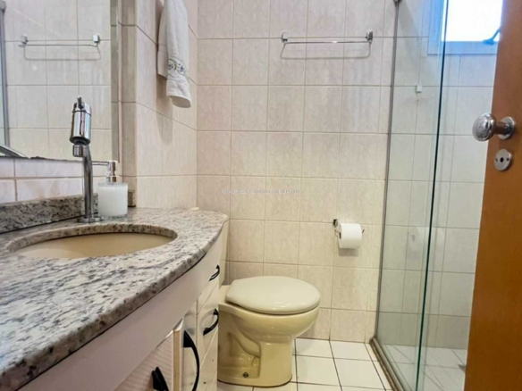 Banheiros (social e suíte) com revestimento em cerâmica, espelho, armário e box em blindex.