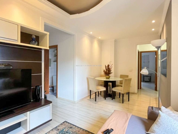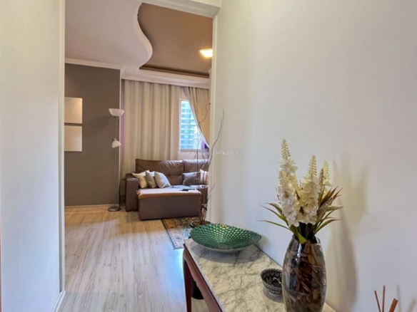 Sala para dois ambientes, com piso laminado de madeira e iluminação planejada, proporcionando conforto e elegância.