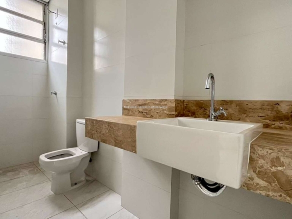 Banheiros (social e suíte) com acabamento em porcelanato.