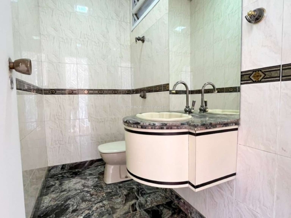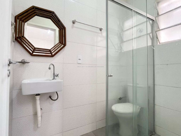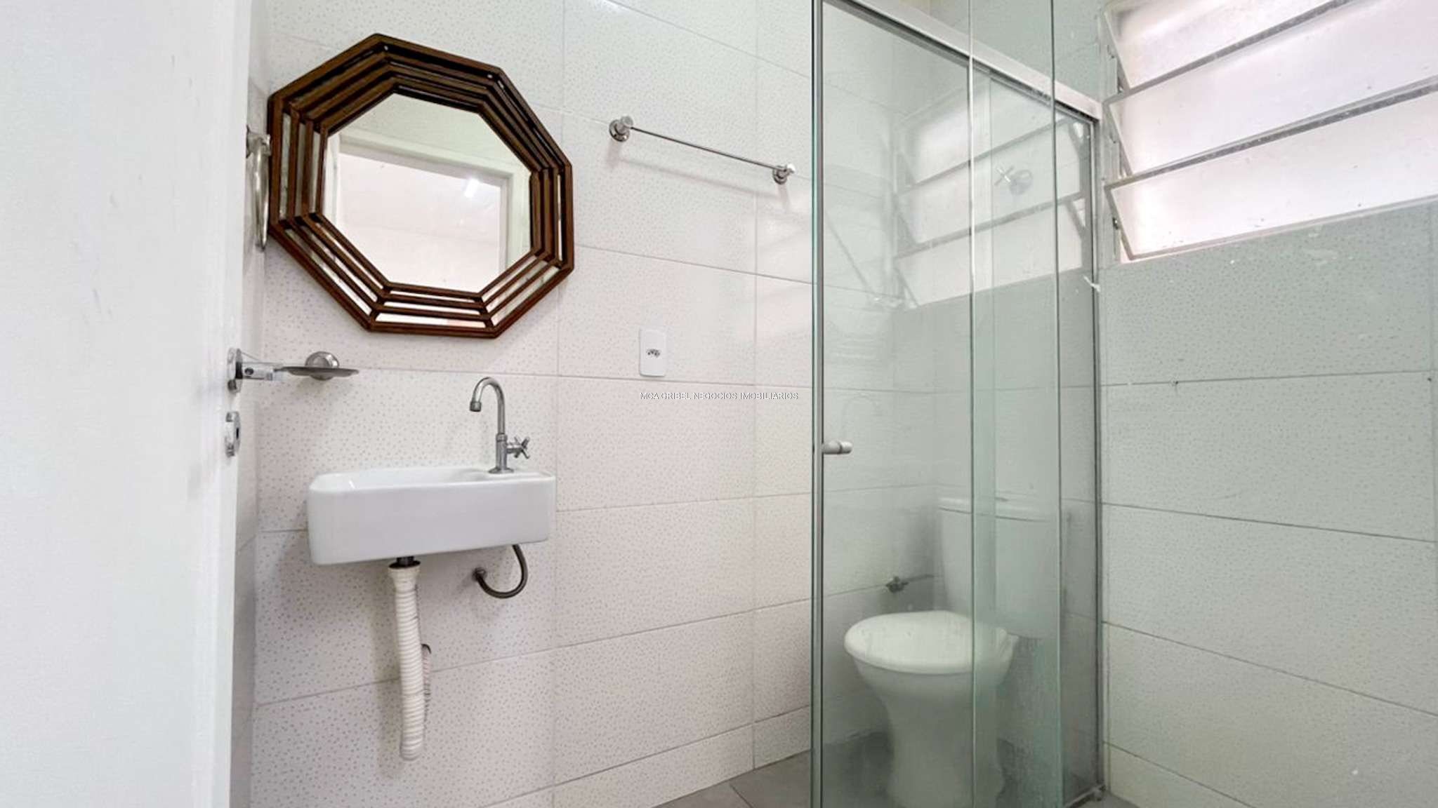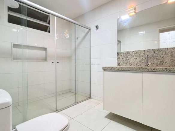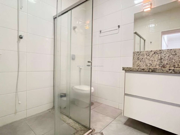 Banheiro social amplo com bancada em granito, espelho, armários planejados e box em blindex