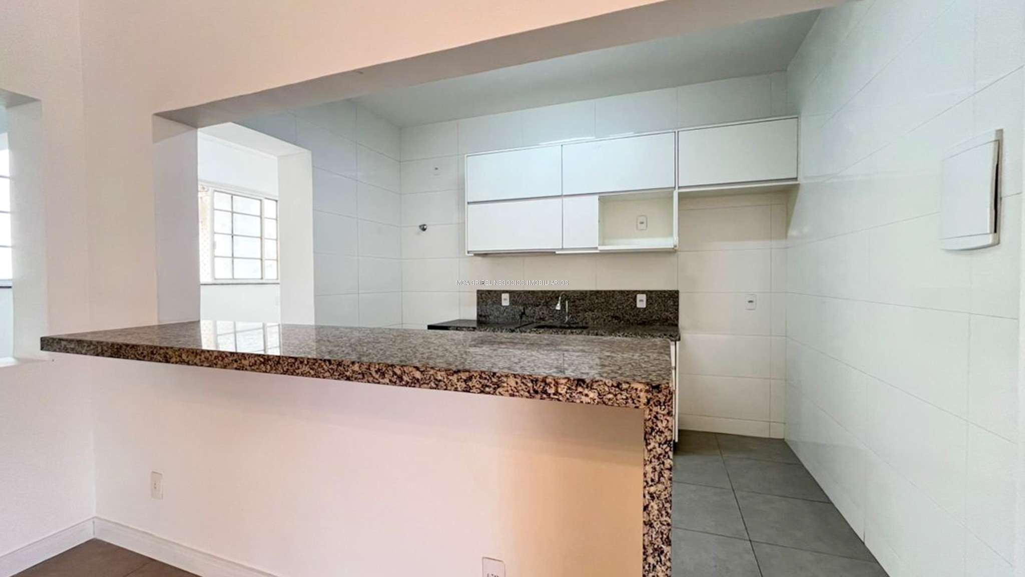 Cozinha ampla com bancada americana em granito, piso em porcelanato e armários planejados