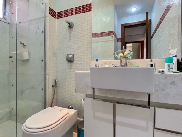 2 quartos amplos com piso em tábua corrida, armários, sendo uma suíte com espelho, bancada em granito, pia em cuba e box em blindex