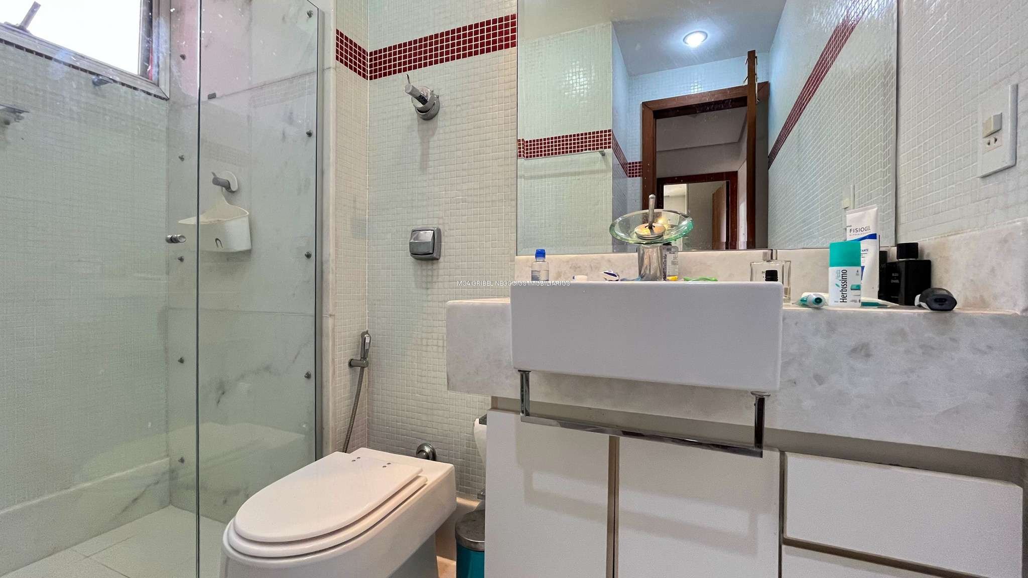 Banheiro social amplo com espelho, bancada em granito e box em blindex