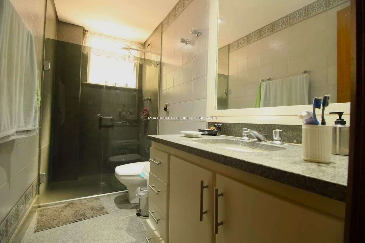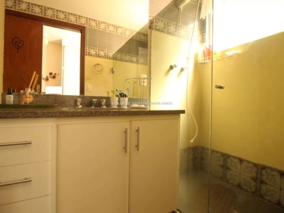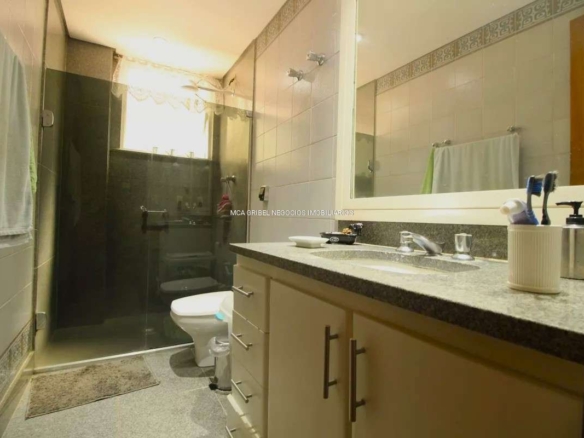 Banheiro social com bancada em granito, espelho, armários e box em blindex