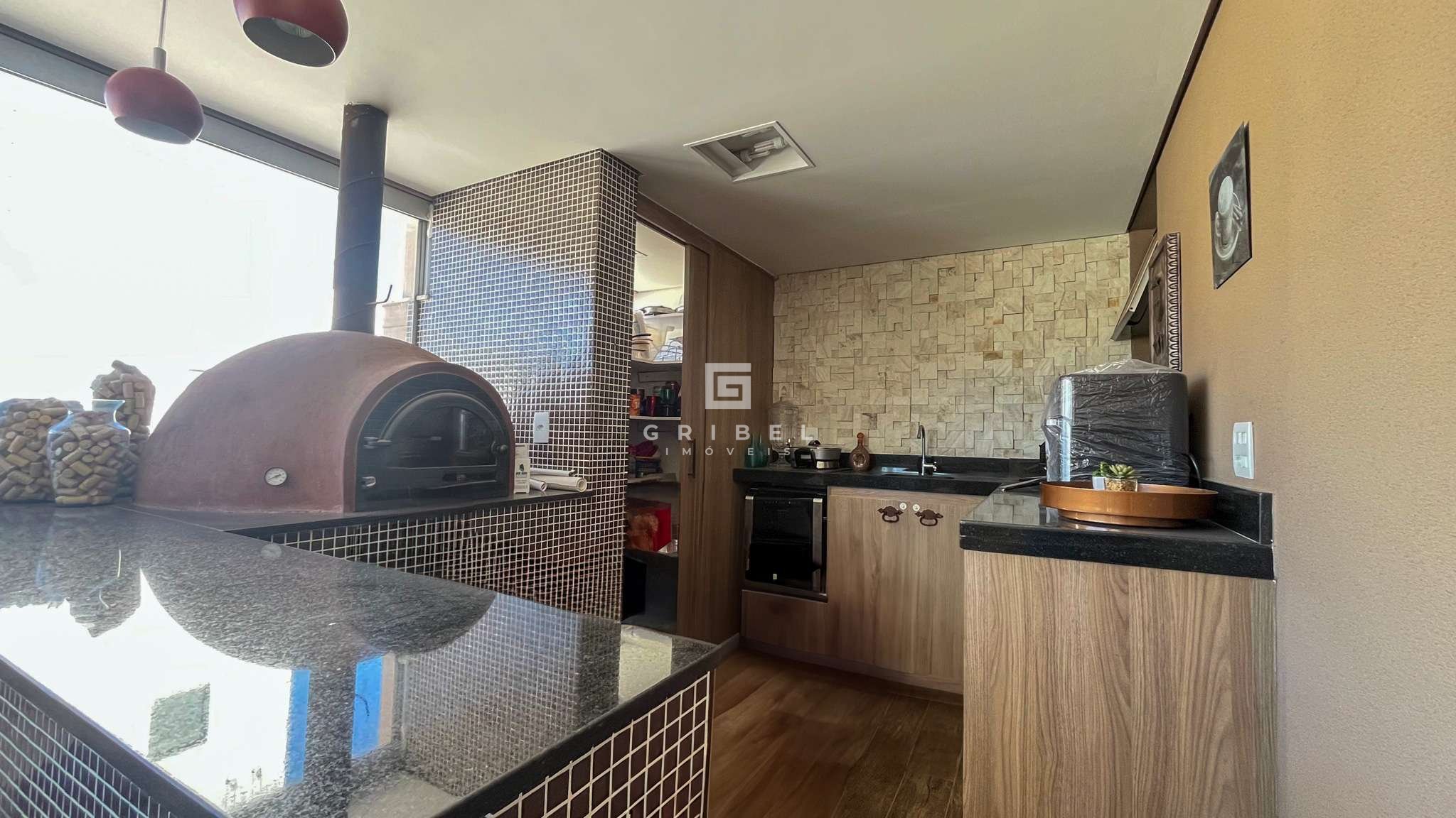 Terraço espaçoso com área gourmet equipada com forno a lenha