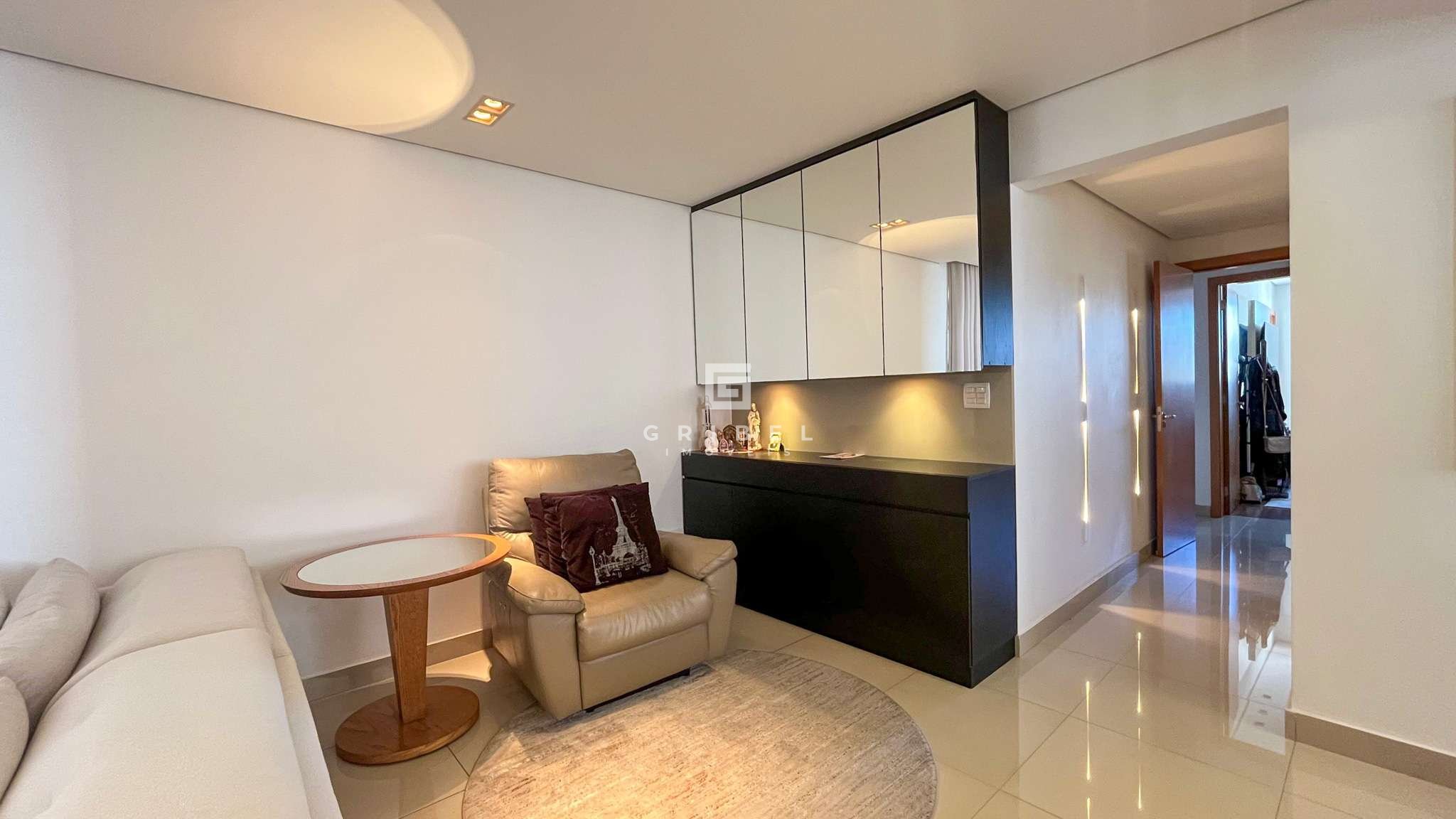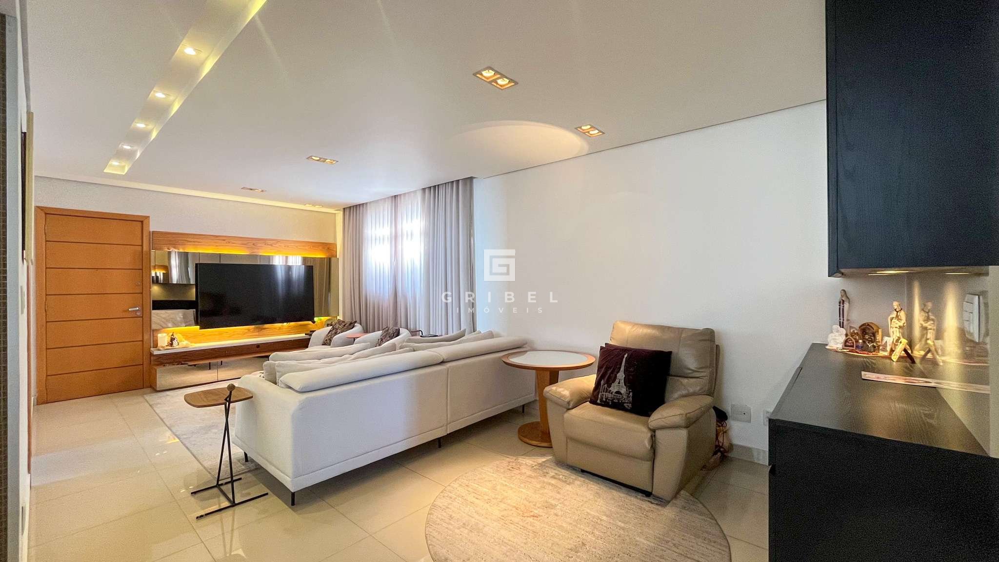 Sala para três ambientes com piso em porcelanato, teto rebaixado em gesso e projeto de iluminação