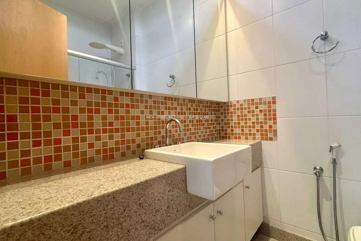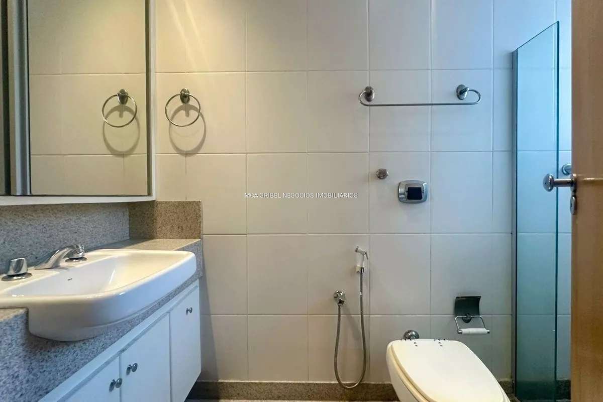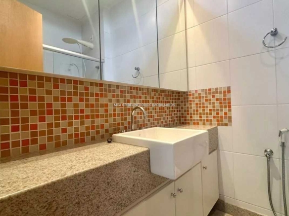 Banheiro social amplo com bancada em granito, armários, espelho e box em blindex