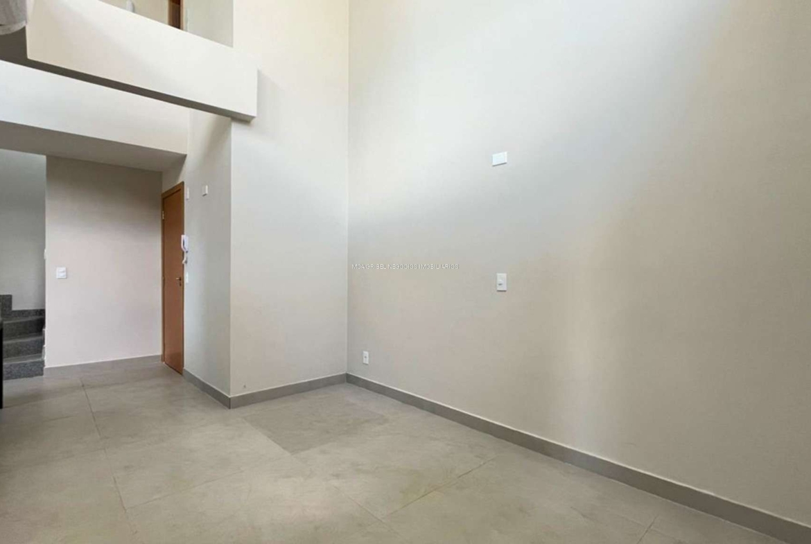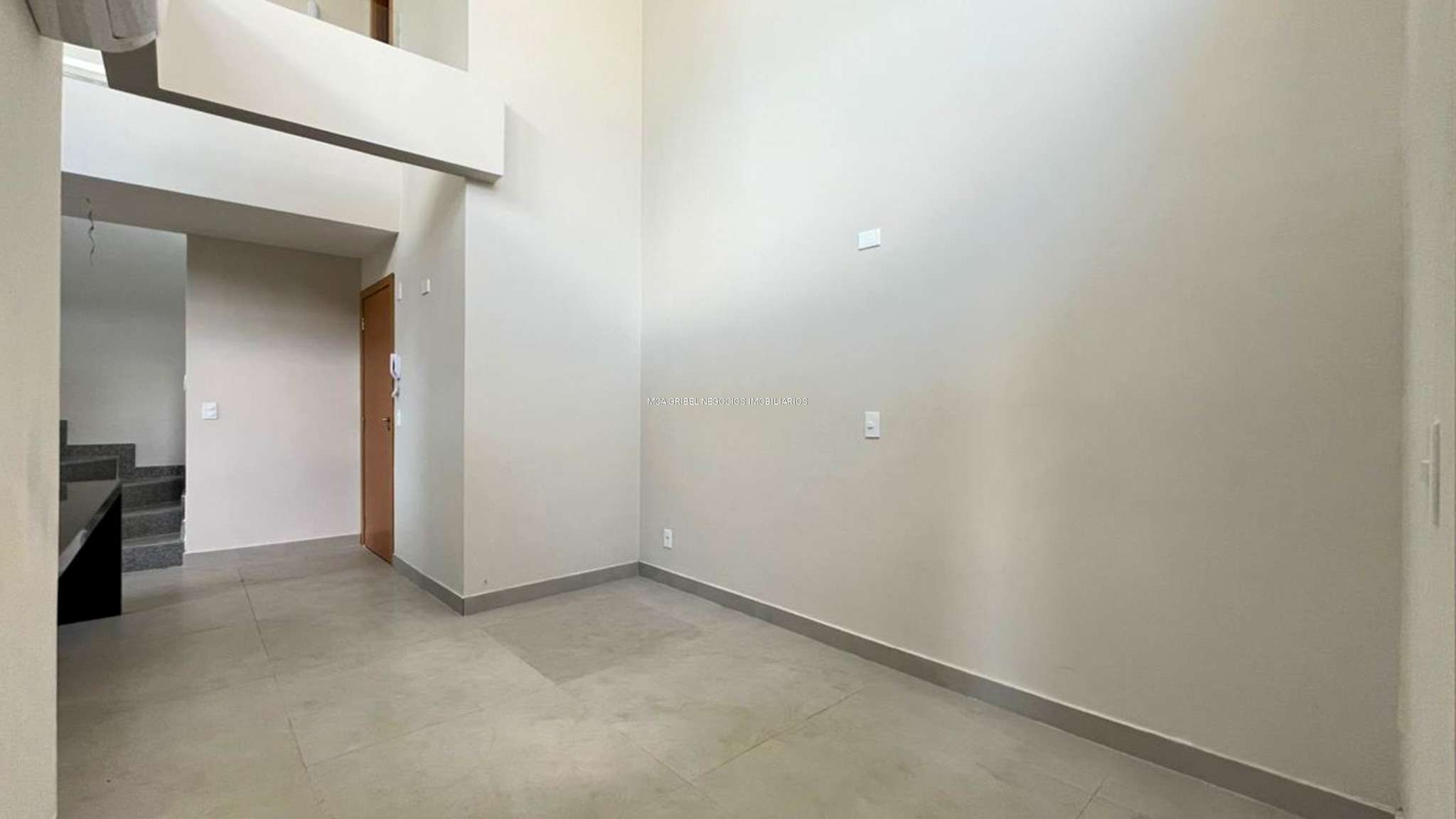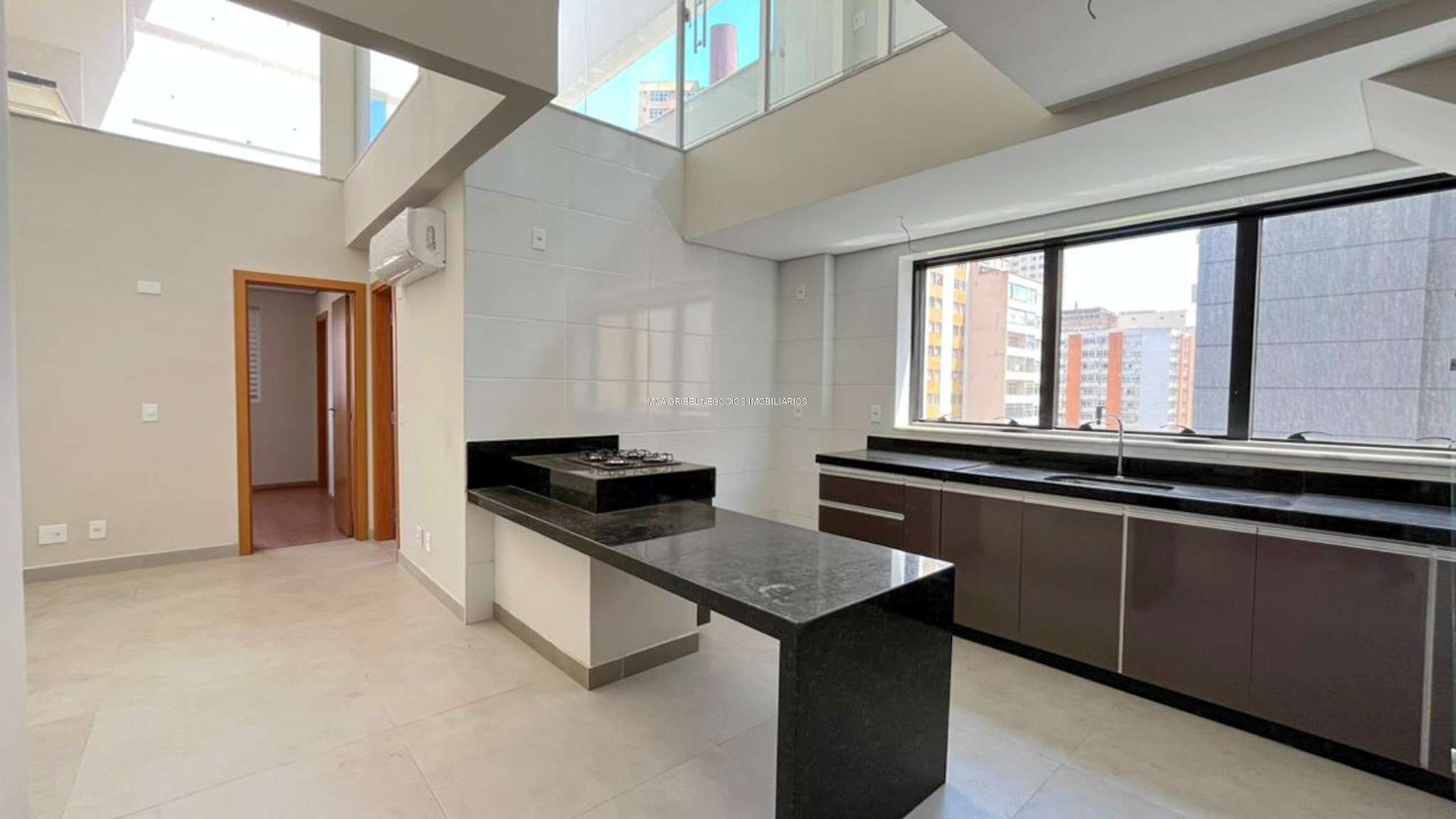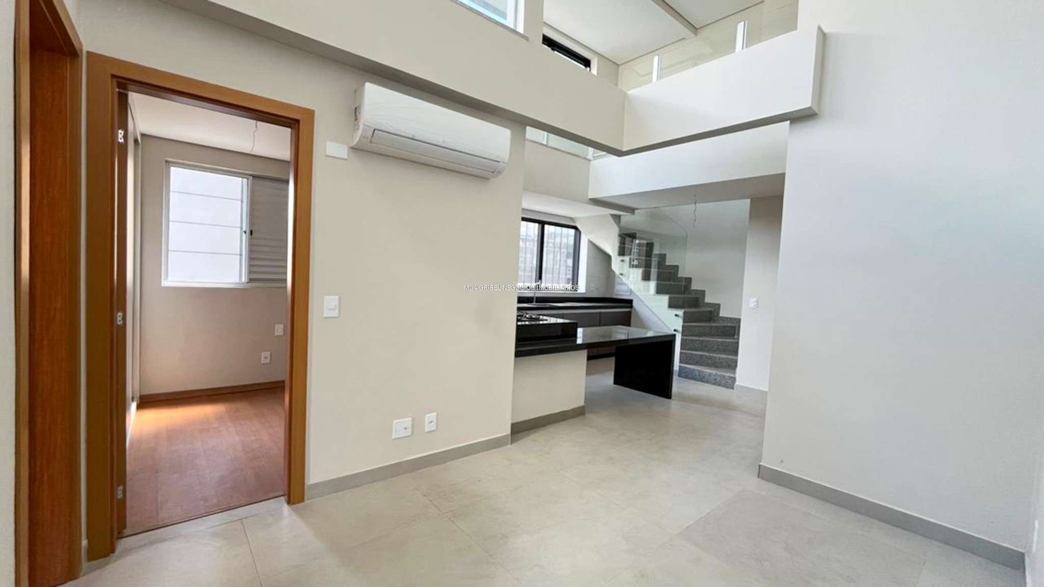 Sala ampla com pé-direito duplo, excelente luminosidade natural, ar-condicionado e piso em porcelanato.