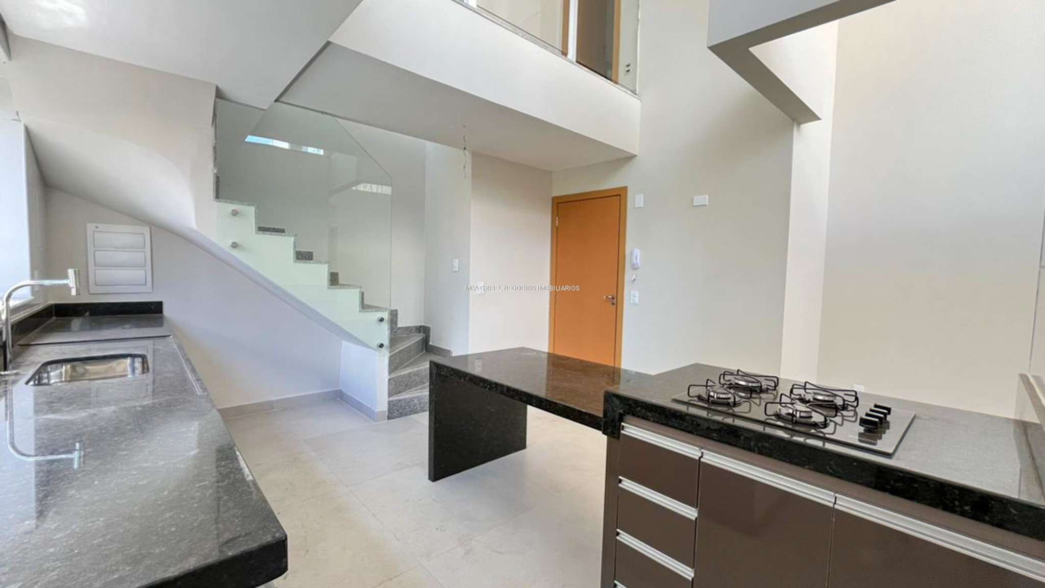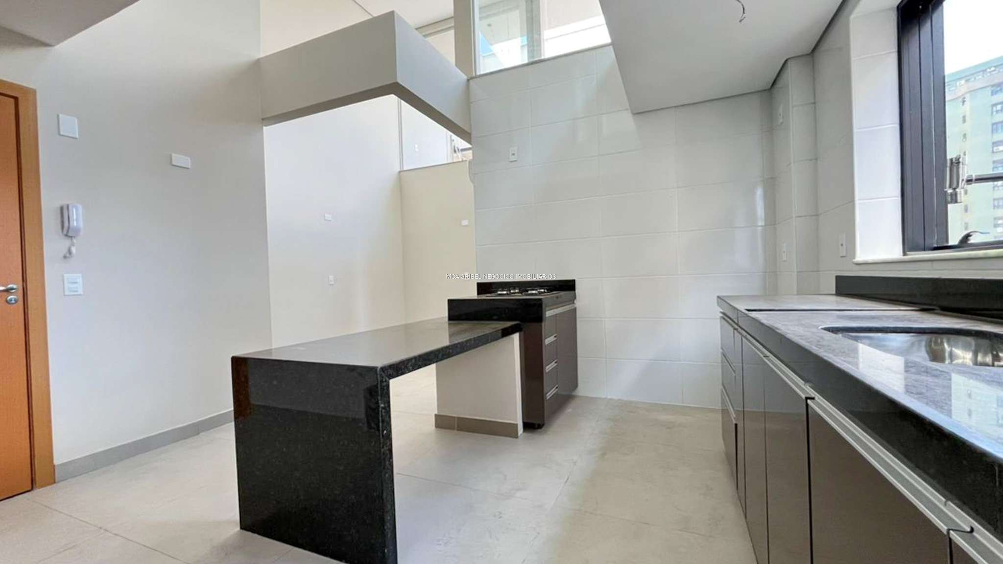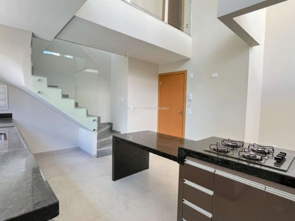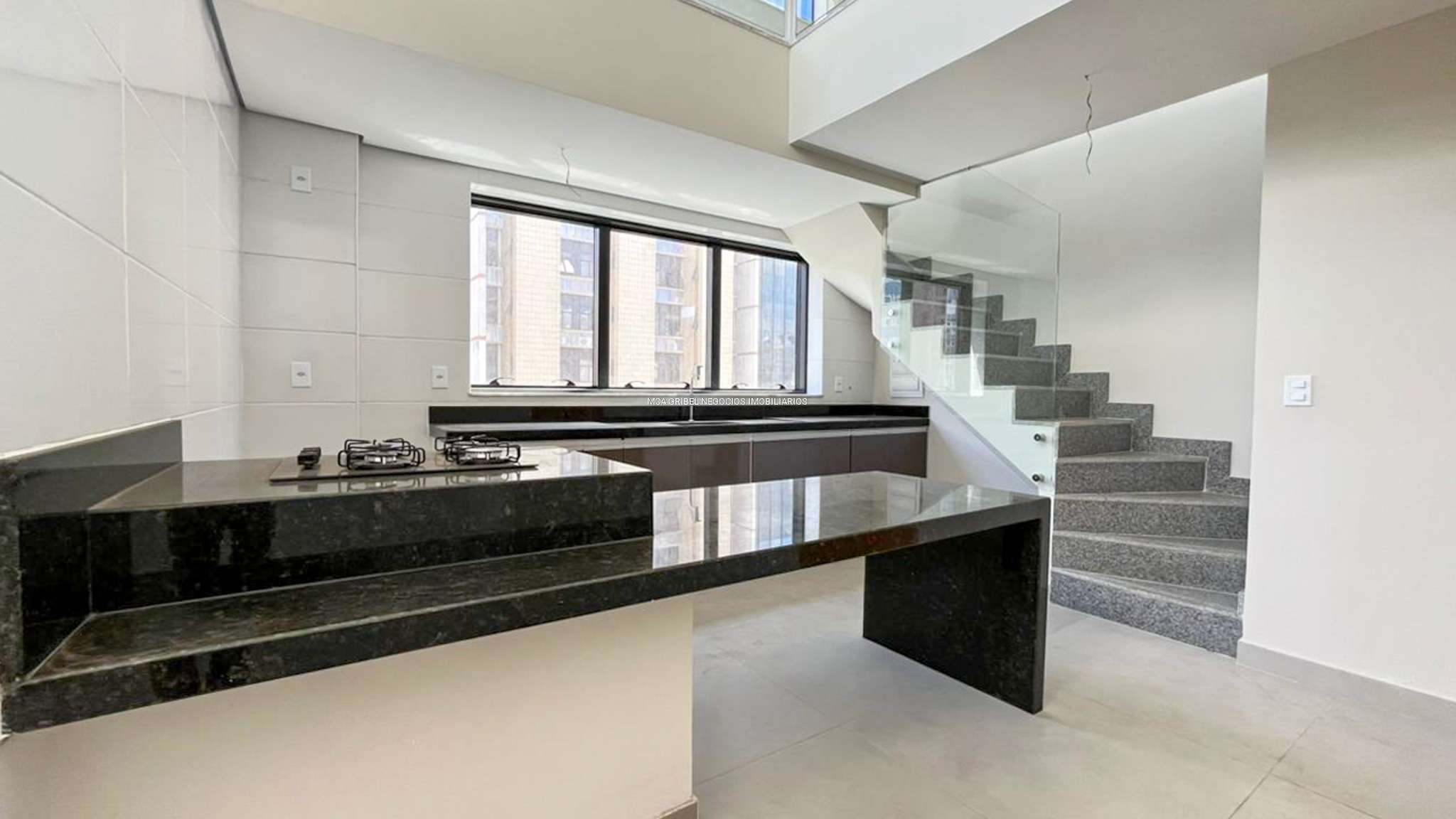 Cozinha americana com ilha central, cooktop, armários planejados e bancadas em granito.