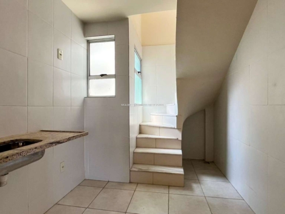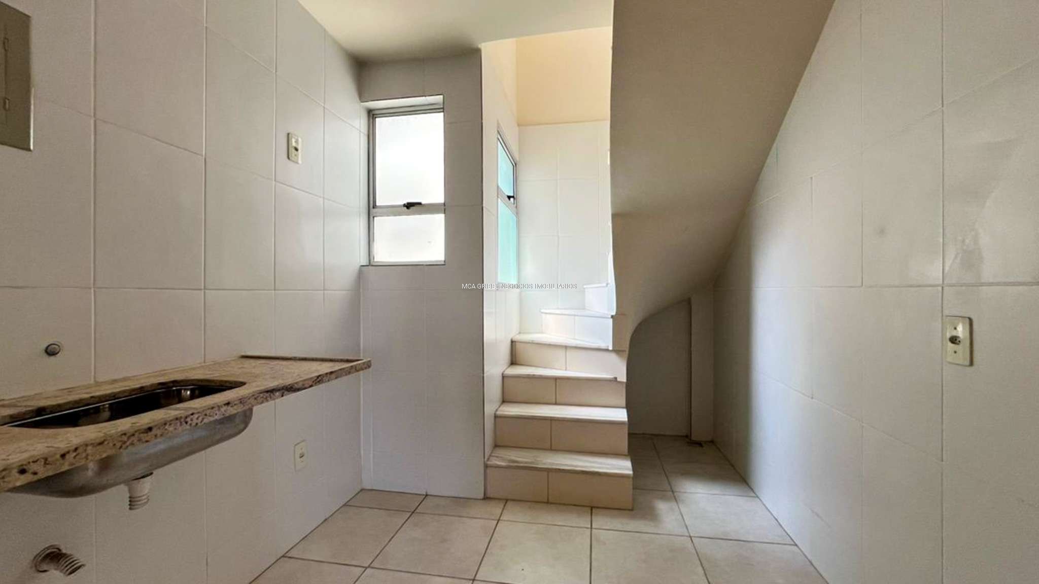 Cozinha espaçosa com piso em cerâmica e bancada em granito, possui a escadaria para o segundo andar