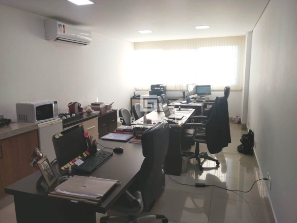 Uma sala com área total de 33,27m². Uma vaga de estacionamento + uma vaga demarcada, todas livres e cobertas.
